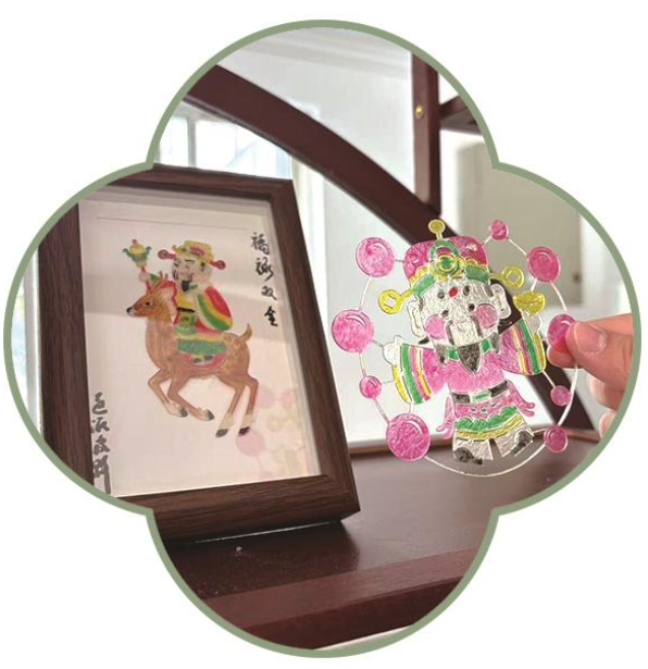 馆内百余平方米的创意空间陈列有一系列“可观、可感、可触摸”的精美产品和体验项目,生动呈现中华优秀传统文化在当代的创新传承。率先映入眼帘的是运用通派皮影技艺制作而成的各类文创产品;除了传统人形皮影,“十二生肖”“福禄寿喜”“梅兰竹菊”系列相框摆件,以及精巧的耳饰、书签等,展现出传统工艺的多样可能。一旁的表演互动区搭建起皮影戏台,让市民在家门口就能欣赏皮影演出。观众除观演外,还可亲手参与皮影制作,从刮磨牛皮、雕刻图样到敷彩缀结,全程感受这项传统手工艺的匠心独运。