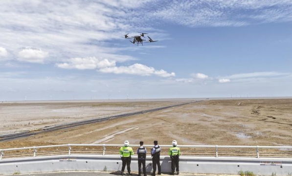 14日,民警、辅警操控无人机在沿海滩涂巡防。连日来,海安市公安局滨海新区派出所加强沿海区域巡逻防控,开展应急救援演练,宣传滩涂安全常识,及时劝阻私自下海人员,消除安全隐患,守护群众安全。 周强摄