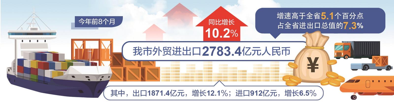 8月单月,我市外贸进出口大幅放量,进出口值突破400亿元。其中,出口303.4亿元,今年以来首次突破300亿元;进口127.5亿元,创近11个月新高。
