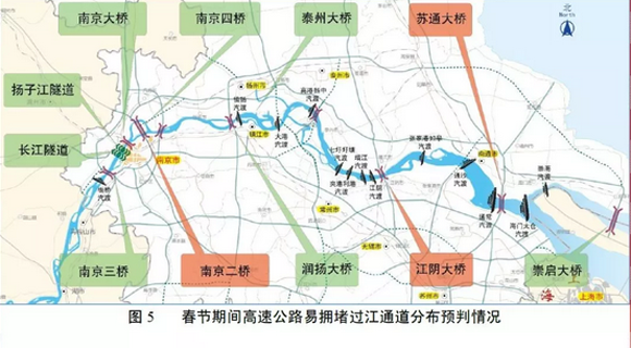 返程期间,南京二桥、江阴大桥、苏通大桥三座过江通道易发生拥堵,且潮汐现象明显,由北往南流量较大。
