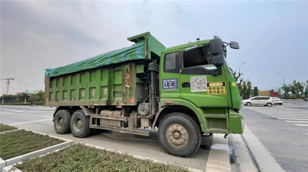 如今,在道路、工地行驶工作的渣土车都有共同的特点:车厢有绿色密闭篷布、车顶有白色顶灯、车尾有黄色放大车牌、车门喷涂上了醒目的二维码。