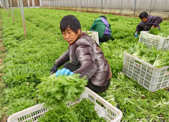 2022年3月21日,菜农在通州东社一处温室内采收蔬菜,保证连续雨天蔬菜供应。