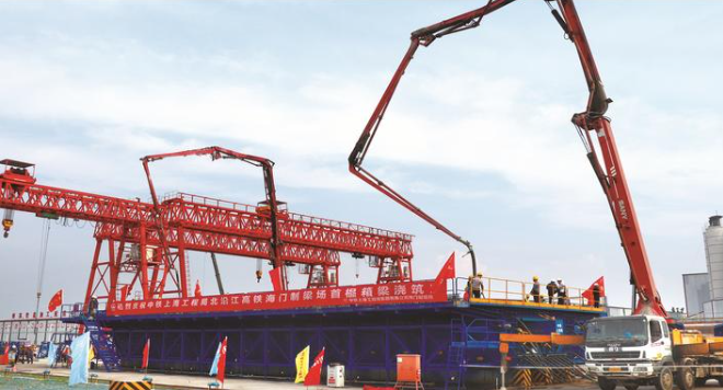 本网讯 14日,中铁上海工程局北沿江高铁6标海门制梁场顺利完成首榀32米箱梁浇筑,标志着项目建设正式进入箱梁试预制生产阶段。