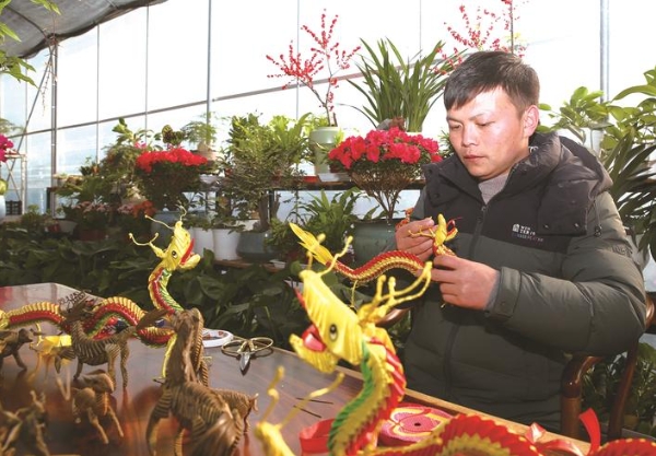 21日,宋庆涛在工作间隙用棕榈叶和彩带编织出生肖龙。小宋是扬州人,在南通上大学时开启绿色创业梦。“明年是龙年,我要带领小伙伴们展现龙马精神,为扮靓第二故乡南通继续努力。”宋庆涛说。