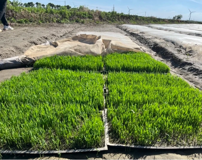 风吹麦田千层浪,又到一年丰收时。10日,通州湾盐碱地改良示范基地内,伴着收割机的轰鸣,金灿灿的麦子颗粒归仓。在育秧基地,绿油油的秧苗长势正旺,本月中旬进行移栽。